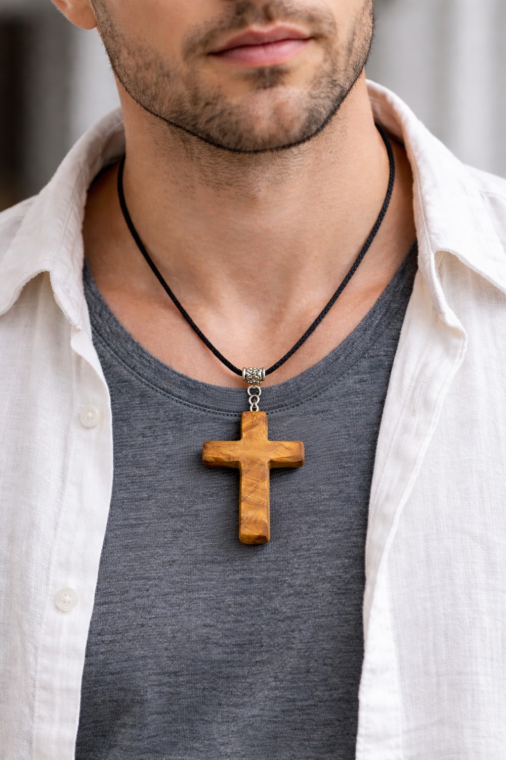1 Collier pendentif Croix en bois d'olivier poli fait main, finition a l'huile, monté sur bélière gravé en alliage et cordon ciré fermoir pince de crabe