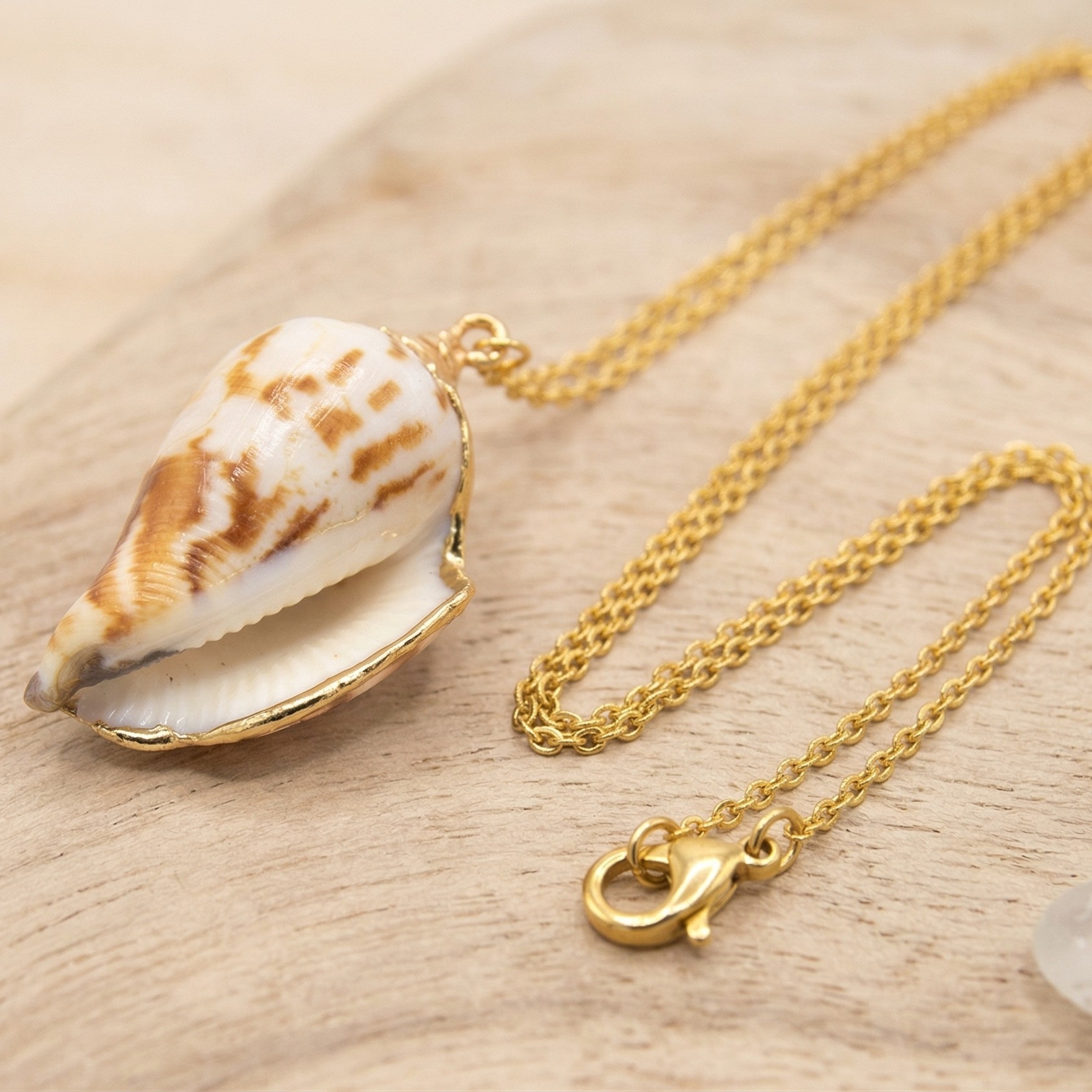 Découvrez ce collier avec véritable coquillage et sa bordure dorée. Pendentif de 3,5 cm monté sur une chaîne en acier inoxydable de 45 cm. Le bijou bohème parfait pour l'été.