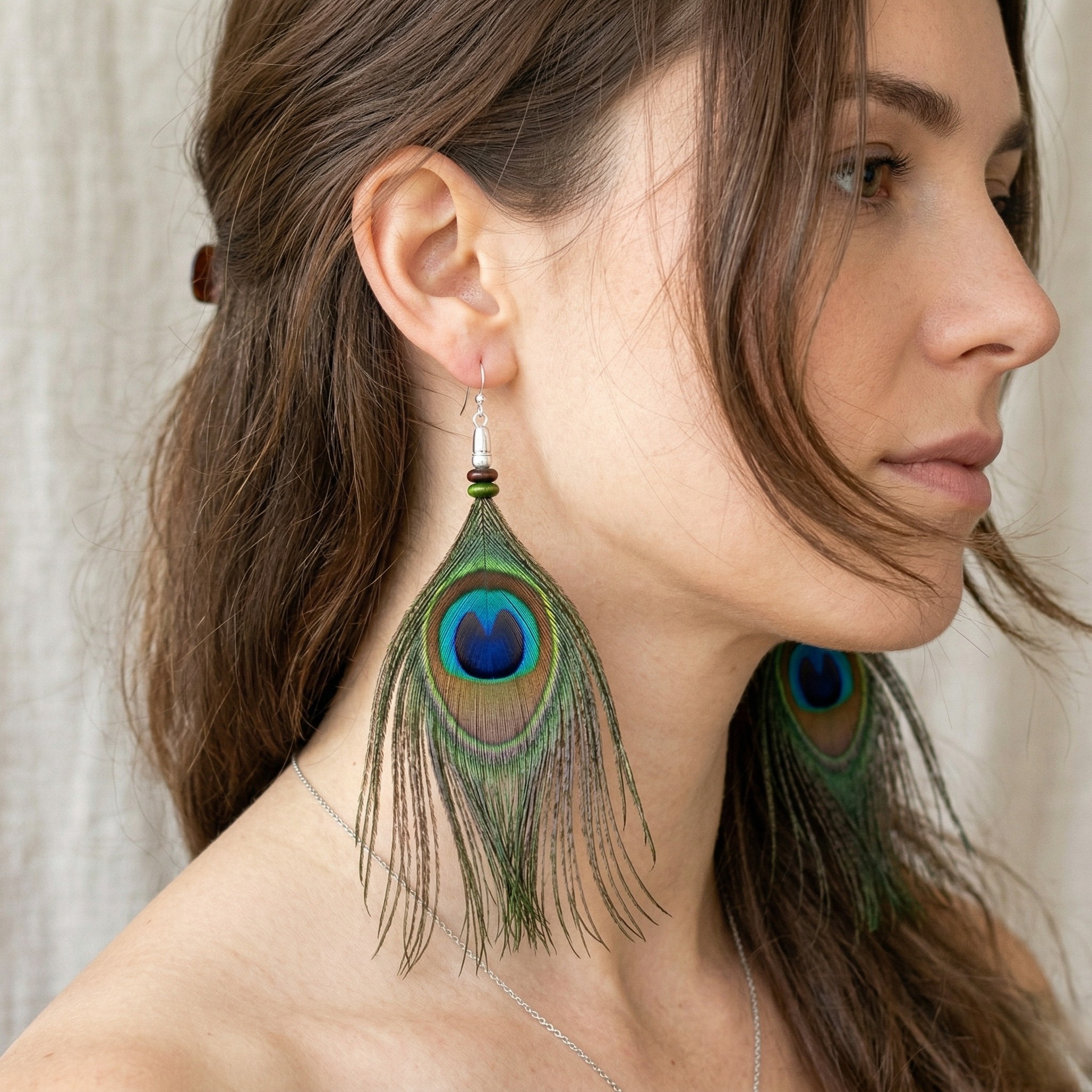 Magnifiques plumes de paon surmonté d'une perle en bois deux couleur et perle métal stardust de couleur argent.