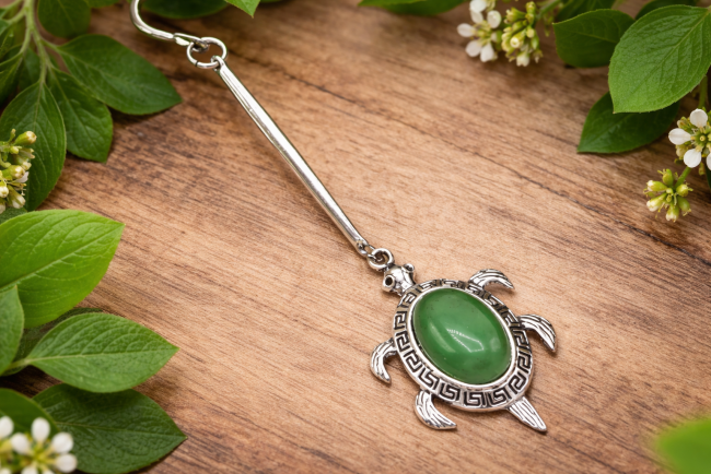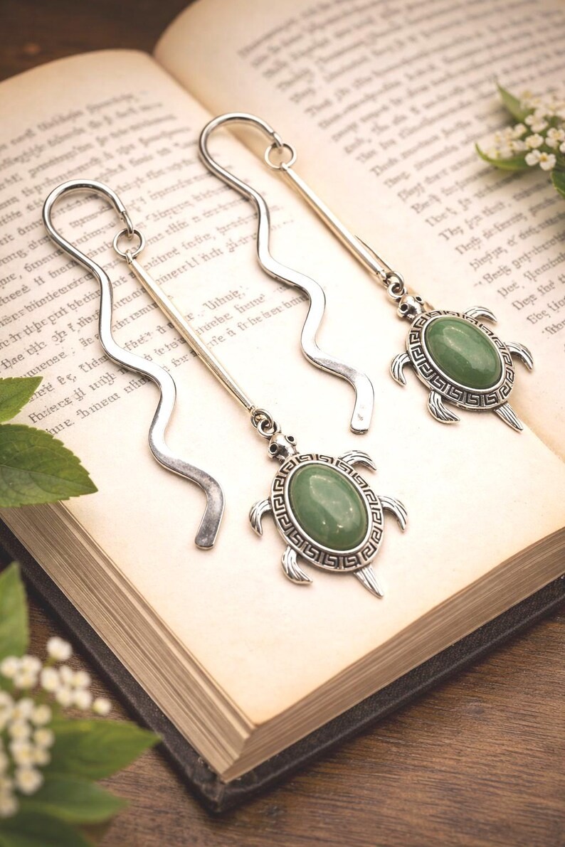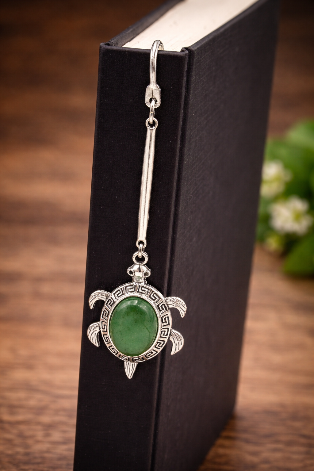 Marque-page tortue en aventurine verte – Bijou de livre artisanal