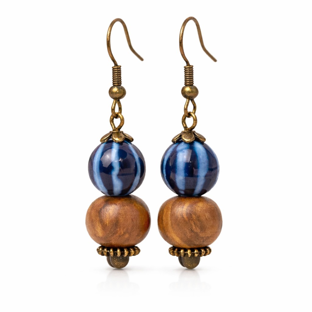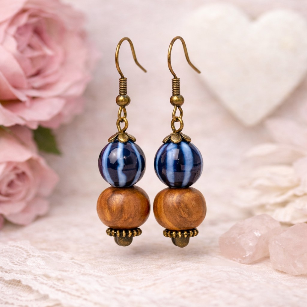 Ces boucles d’oreilles bohèmes en bois naturel allient la chaleur authentique de l’olivier à la finesse lumineuse de la céramique. Un bijou féminin, léger et original, idéal pour un style naturel, chic ou ethnique.