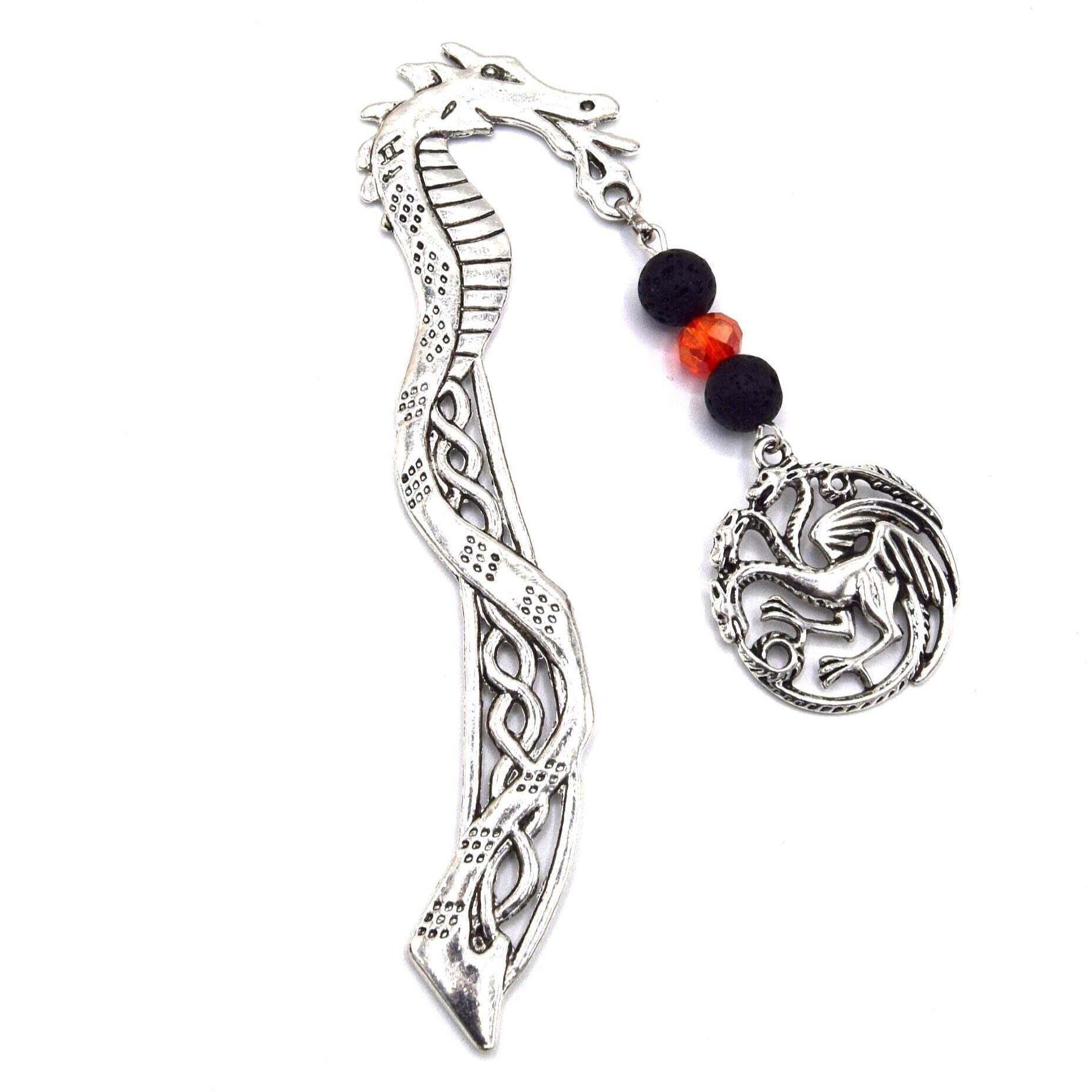 Très joli marque-page dragon en métal, accompagné de son pendentif chimère et de perles décoratives.