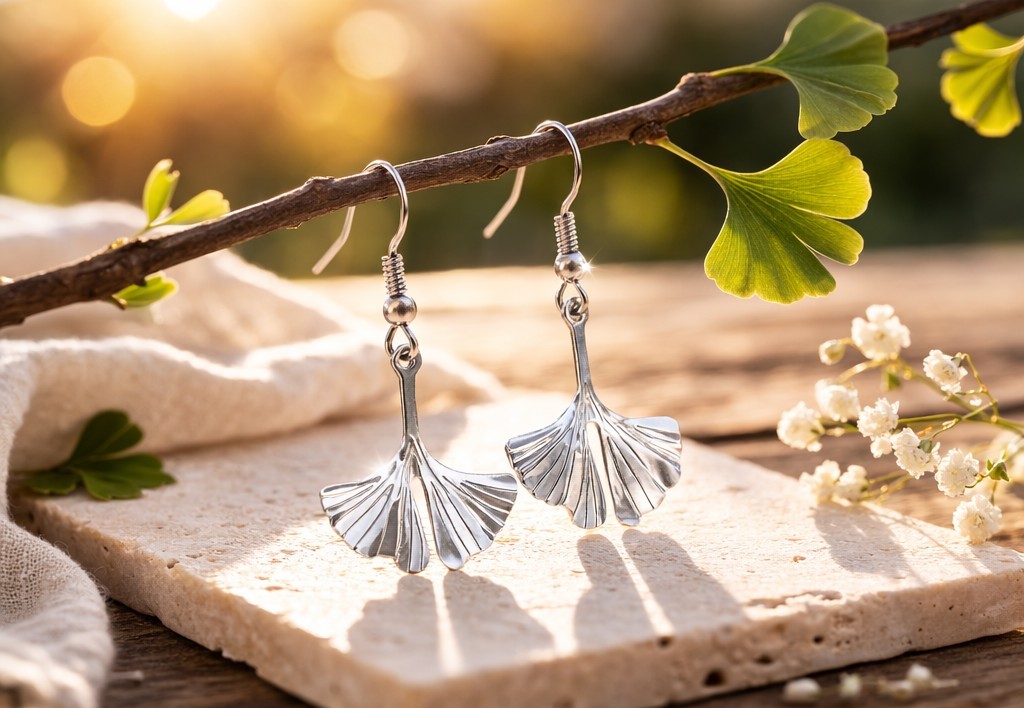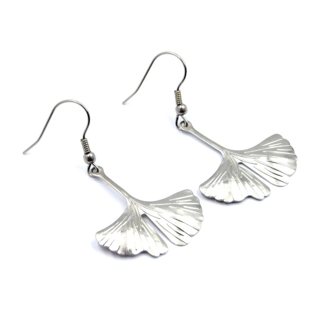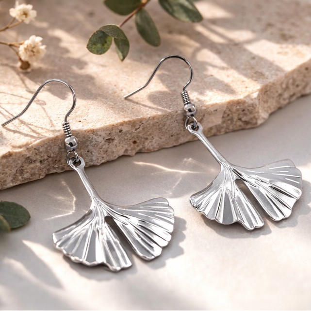 🌿 Boucles d’oreilles feuille de Ginkgo en acier inoxydable argenté – 6 cm