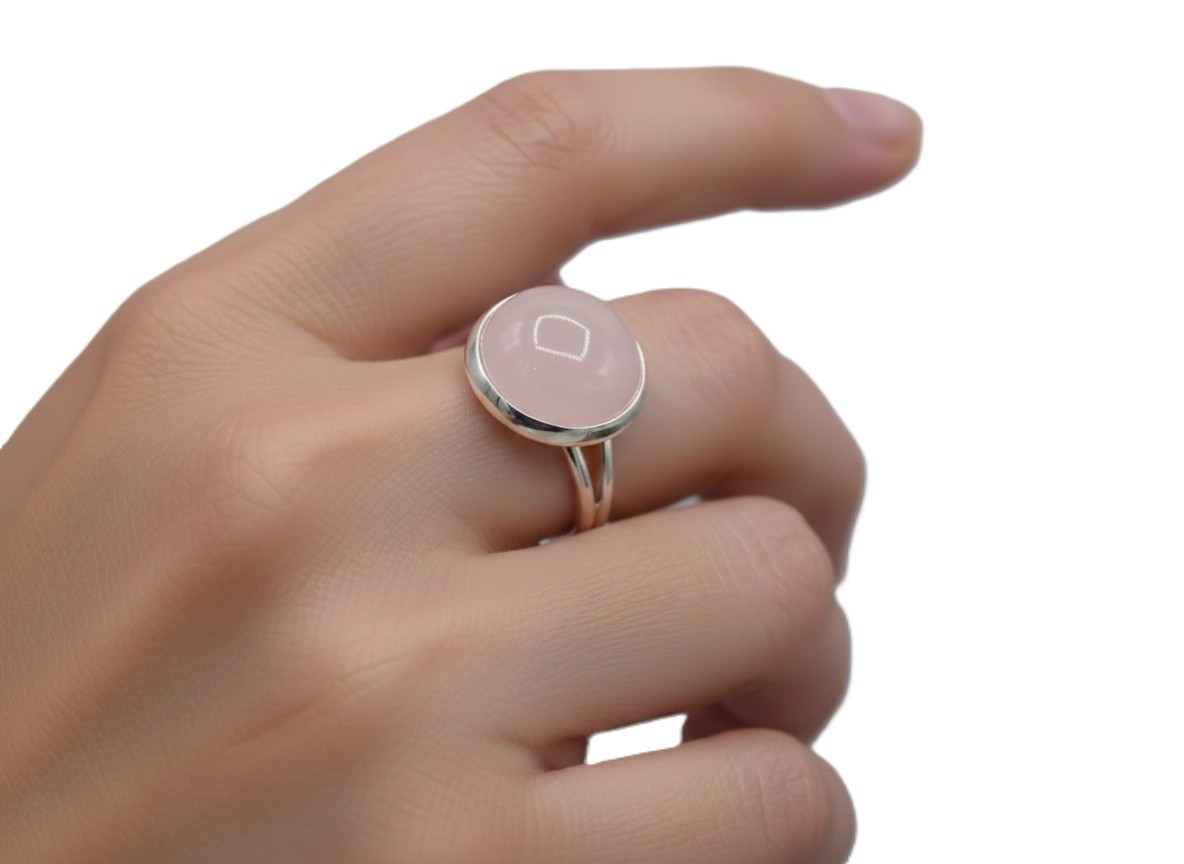 Bague métal argenté, et pierre en quartz rose rond 12mm.