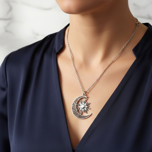 Collier pendentif soleil et lune argenté, collier celtique, pendentif éclipse
